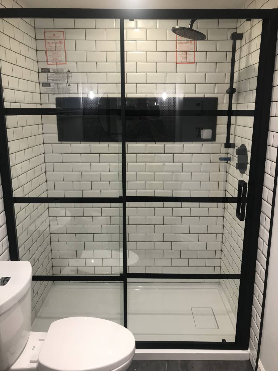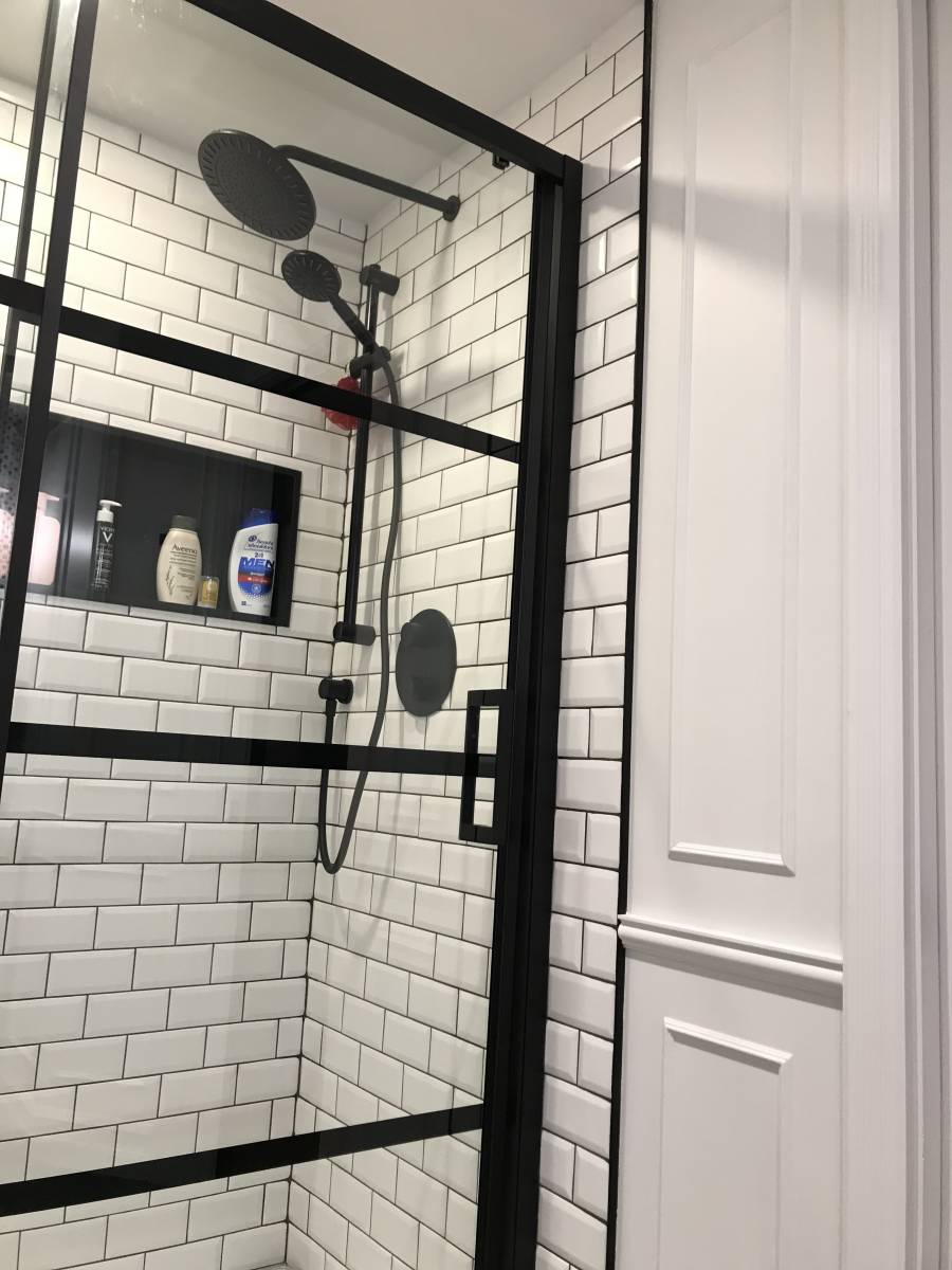 Pour commencer, des moulures ont été ajoutées aux murs, apportant une touche classique et raffinée qui rappelle l'architecture d'époque. La douche a été entièrement rénovée, avec l'installation d'un receveur plat pour un accès facile et une esthétique contemporaine. Le mur de la douche et celui derrière le meuble vasque ont été habillés de faïence, renforçant l'élégance de la pièce tout en offrant une surface facile à entretenir.